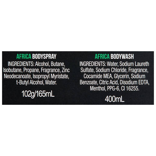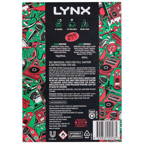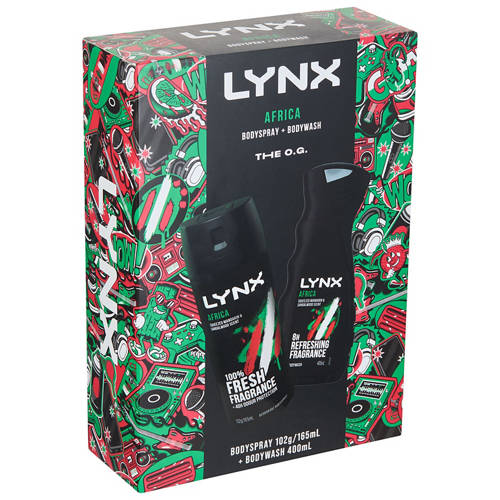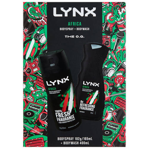 Lynx Duo Africa Gift Set includes Lynx Africa Deodorant Body Spray 165ml and Lynx Africa Shower Gel 400ml.