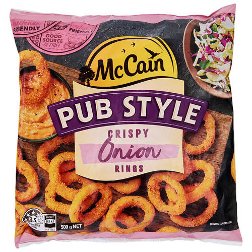 McCain Pub Style Onion Rings are a delicious snack with a crunchy golden coating. Good source of fibre. Vegetarian friendly