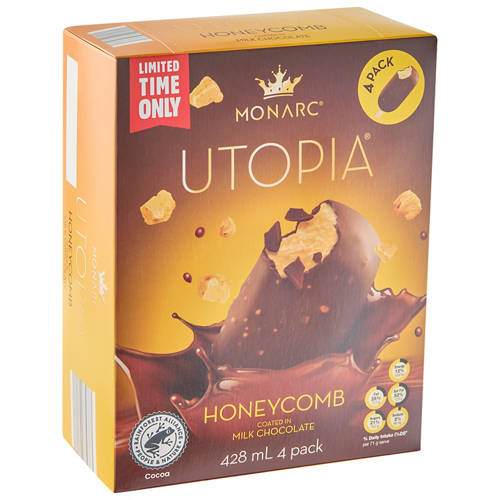 Smooth & creamy honeycomb flavoured ice cream coated in milk chocolate with crunchy honeycomb bits..
