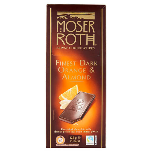 Indulge in this finest dark chocolate with fruity orange and almond pieces. Made with no artificial colours, flavours or preservatives.