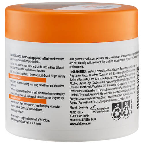 Natures Essence Frutia Caring Papaya 3 in 1 hair mask contains Papaya Extract, Coconut Oil and Provitamin B5. This hair mask is a true multi-talent and can be used as conditioner, hair treatment or leave In conditioner, depending on what your hair needs.