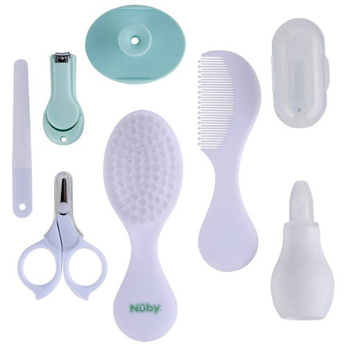Health care kit contains nail scissors, nail clippers, brush, comb, silicone scrubbie, finger toothbrush, nasal aspirator, and a nail file.