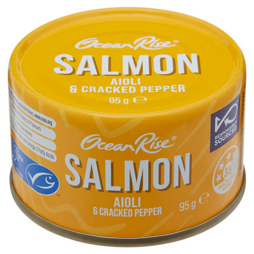Skinless and boneless flavoured salmon flakes with aioli and cracked pepper. Good source of protein and omega 3. No artificial colours, flavours or preservatives.