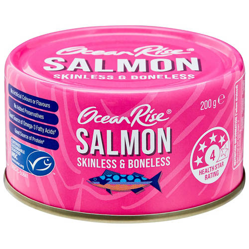 Skinless and boneless salmon flakes. Good source of protein and omega 3. No artificial colours or preservatives.