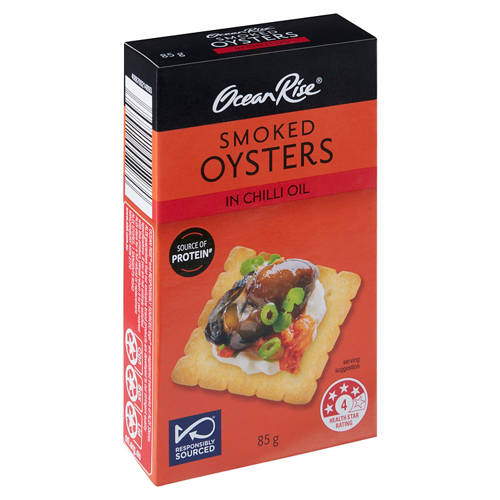 Ocean Rise Smoked Oysters in chilli oil, add on a cracker for a delicious snack. Good source of protein. No artificial colours, flavours or preservatives.