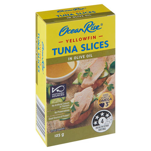 Yellowfin tuna slices in olive oil, perfect in a salad or sandwich. No artificial colours, flavours or preservatives. Good source of omega 3 fatty acids and protein.