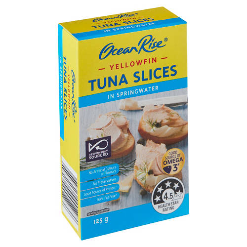 Yellowfin tuna slices in springwater, perfect in a salad or sandwich. No artificial colours, flavours or preservatives. Good source of omega 3 fatty acids and protein. 99% fat free.