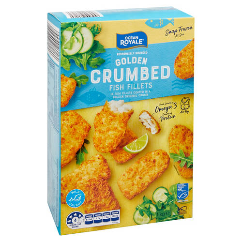 Ocean Royale Golden Crumbed Fish Fillets are made from sustainably certified wild-caught Alaska Pollock. They contain no artificial colours, flavours, or added preservatives. Coated in a crispy crumb for a delightful crunch, these tasty fillets are perfect for quick meals or snacks.Good source of Omega 3.Source of protein.