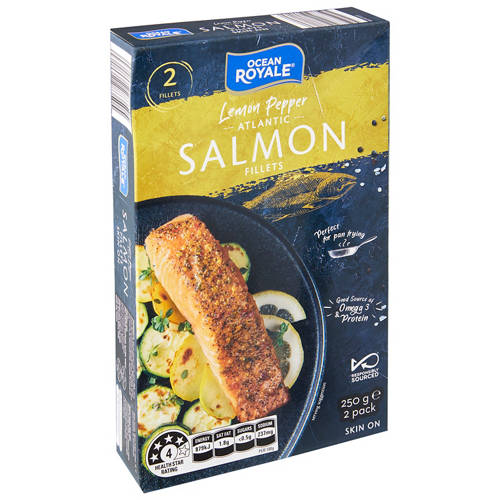 Our Ocean Royale Lemon Pepper Atlantic Salmon Fillets are perfect for pan frying. They contain no artificial colours or preservatives. Each pack contains two fillets.