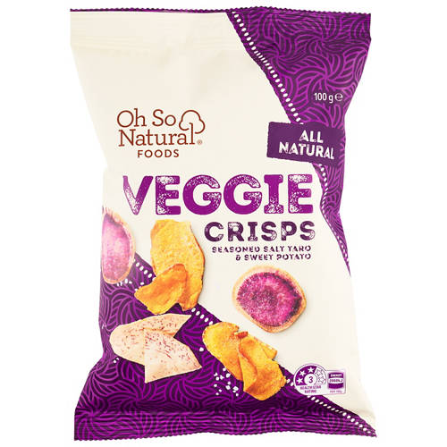 All Natural Seasoned Salt Taro and Sweet Potato flavoured crisps. Made with no artificial colours, flavours or preservatives. No added MSG. Non-GMO. Plant Based. Suitable for vegetarians and vegan.