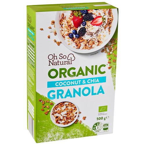 Oh So Natural Organic Coconut & Chia Granola offers a delightful crunch with organic wholegrain oats, coconut chips, and chia seeds. Made in Germany, it's perfect for a wholesome breakfast or a satisfying snack. It's suitable for vegans and vegetarians, with no artificial colors, flavours, or preservatives. Enjoy it with yogurt or fruit for a delicious treat.
