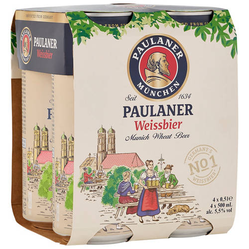 Paulaner Hefe Weissbier is a traditional German wheat beer known for its cloudy appearance and balanced blend of fruity and yeasty flavors, conveniently offered in a 4-pack of 500ml cans. Perfect for those who enjoy a refreshing and authentic beer experience.