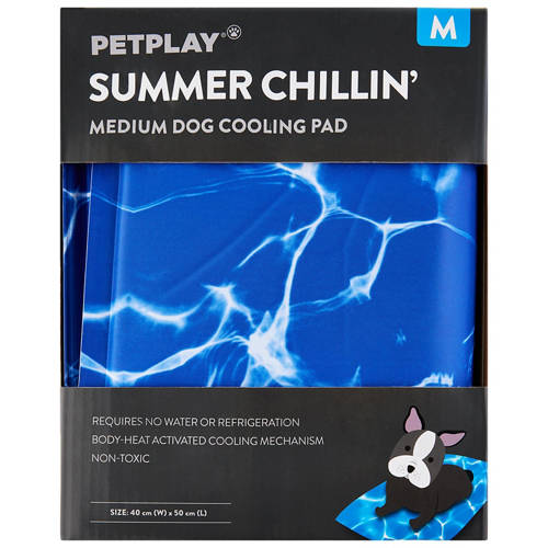 Features body heat activated cooling. Requires no water or refrigeration. Non-toxic. Assorted designs. Available in 2 sizes: Medium: 40cm x 50cm, Large: 60cm x 90cm..