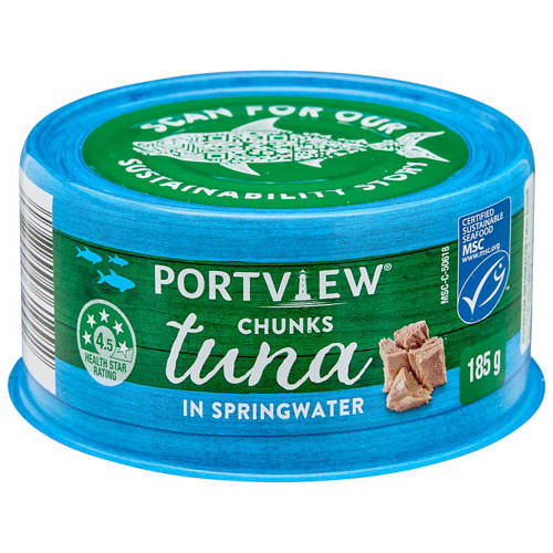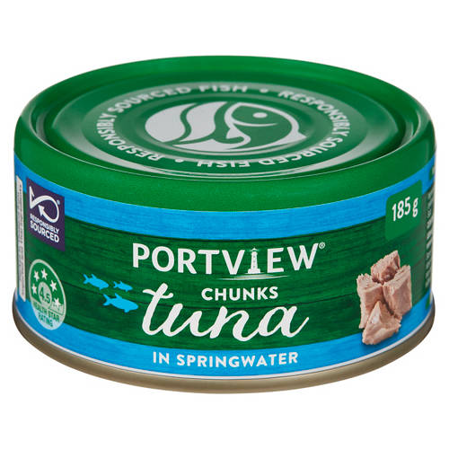Skipjack tuna chunks in springwater, offering a good source of protein and omega-3 fatty acids. No artificial colours, flavours or preservatives. 99% fat free.