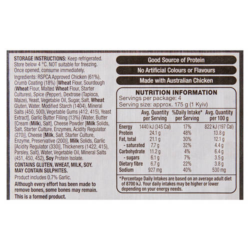100% Australian RSPCA Approved chicken breast, with a delicious garlic butter filling and a crunchy crumb on the outside.