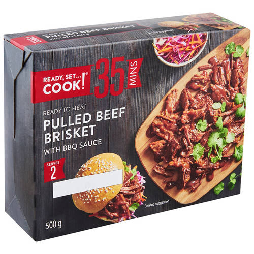 Ready to heat pulled beef brisket with BBQ sauce, ready in just 35 minutes.