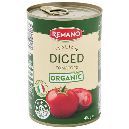 Enhance your dishes with our Organic Diced Tomatoes, made with authentic Italian tomatoes. Perfect for sauces, soups, or stews. It contains no artificial colours, flavours or preservatives, and is low fat. With a 4.5 Health Star Rating, they are also suitable for vegetarians and vegans. They are a great pantry staple with rich Italian flavou