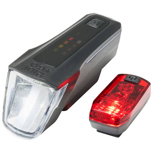 Set includes Headlight, Rear light, brackets & charging cable.