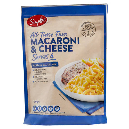 Whip up a quick and delicious macaroni and cheese pasta and sauce mix in just 10 minutes. 98% fat free. Made with no artificial colours, flavours. No added Preservatives. No added MSG. Suitable for vegetarians. Made with 100% Australian Durum Wheat Semolina.