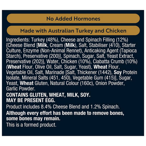 Australian Turkey and Chicken chopped and shaped with a cheese and spinach filling, coated in a crispy ciabatta crumb. A festive twist on a classic made with Australian turkey and chicken.