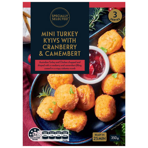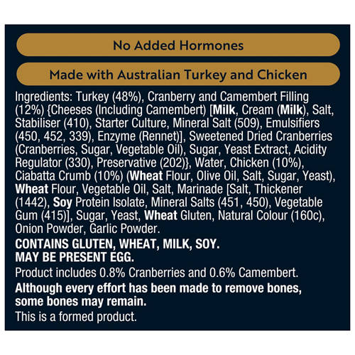Australian Turkey and Chicken chopped and shaped with a cranberry and camembert filling, coated in a crispy ciabatta crumb. A festive twist on a classic made with Australian turkey and chicken.