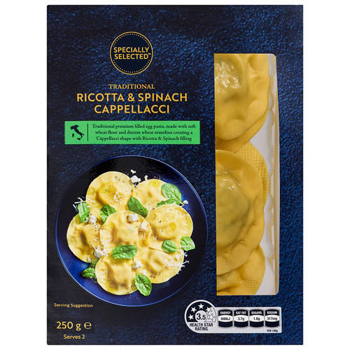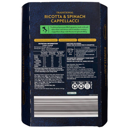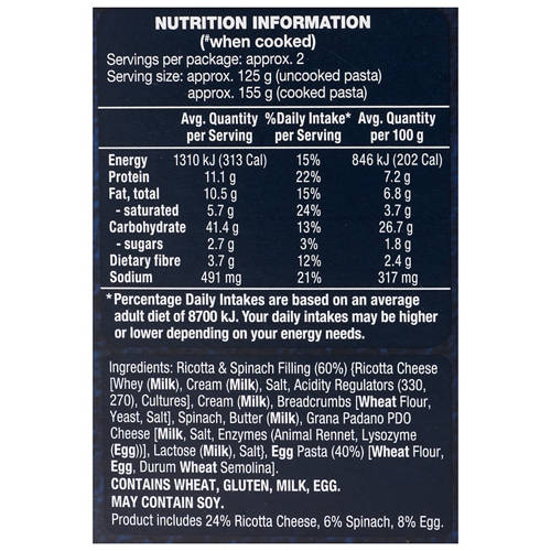 Traditional premium egg pasta, filled with ricotta and spinach.