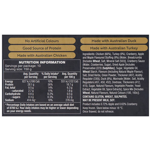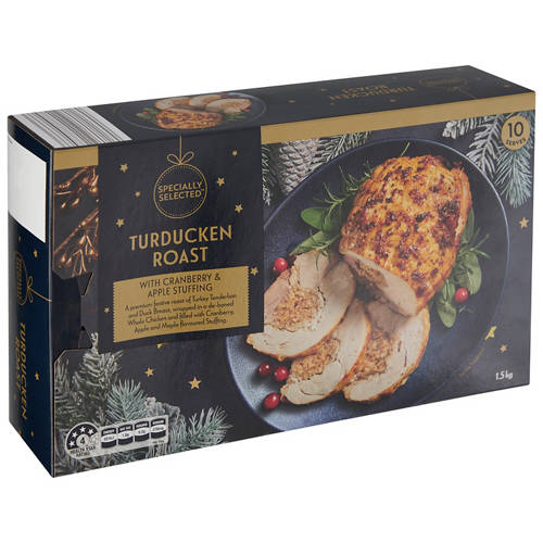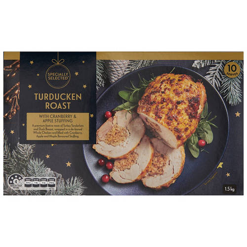 The ultimate festive roast! A premium roast of Turkey Tenderloin and Duck Breast, wrapped in a de-boned Whole Chicken and filled with Cranberry, Apple and Maple flavoured stuffing.