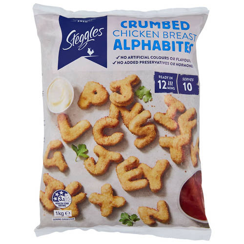 These tasty shaped chicken letters in a golden crumb are great for snacking and quick midweek meals. No Artificial Colours or Flavours. Good Source of Protein.