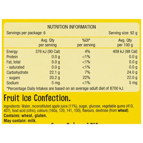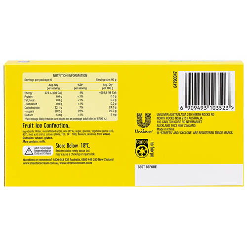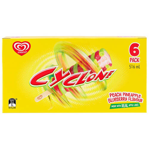Bursting with juicy freshness, Streets Cyclone Ice Blocks feature a refreshing swirl of three delicious fruit flavours – peach, pineapple and blueberry! Made with real apple juice, these are a great treat for the kids. Available in a 6 pack, they’re easy to share with family and friends on a hot day or as a fun snack anytime.