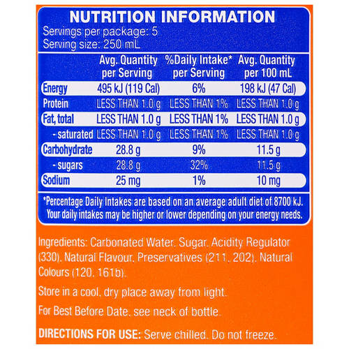 Orange flavoured soft drink. Enjoy on its own or use as a mixer. Made in Australia.