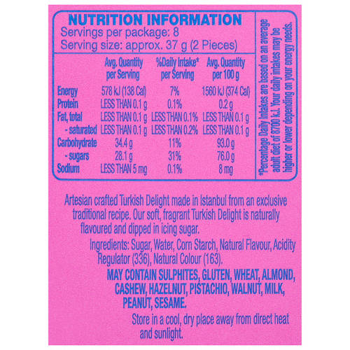 Soft, chewy, and delicately flavored, these bite-sized cubes dusted with icing sugar offer a delightful balance of sweetness and texture. Choose from Rose or Pomegranate.
