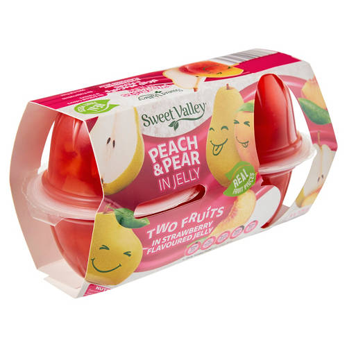 Diced peaches and pears in strawberry flavoured jelly. 99% fat free. No artificial colours, flavours or preservatives.