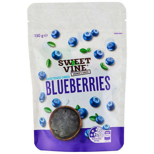 Sweetened dried blueberries. Suitable for vegetarians and vegans. 99% fat free.