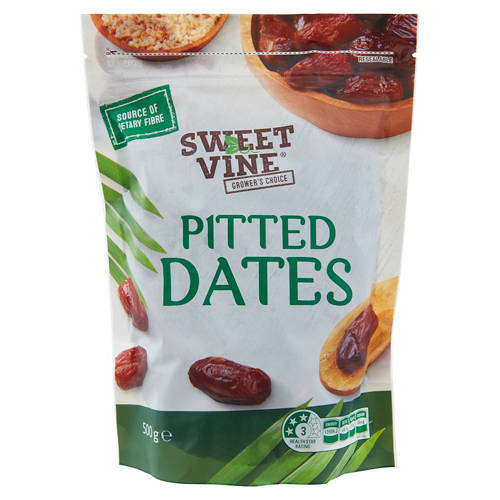 Pitted Dates are a healthy tasty addition to your breakfast or for an afternoon snack. 99% Fat Free. No artificial colours or flavours. Good source of dietary fibre.