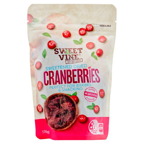 Sweetened dried canberries are a good source of fibre, and are great for baking or snacking.