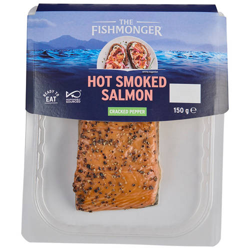 Indulge in The Fishmonger Cracked Pepper Hot Smoked Salmon, delicately smoked with beech wood chips for a gourmet touch. Made with Atlantic salmon with no artificial colours or preservatives, it's ready to eat and perfect for enhancing salads or stunning charcuterie boards, providing a pure and delicious experience.