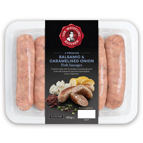 Freshly made with Australian coarsely ground Pork and balsamic and red caramelised onion