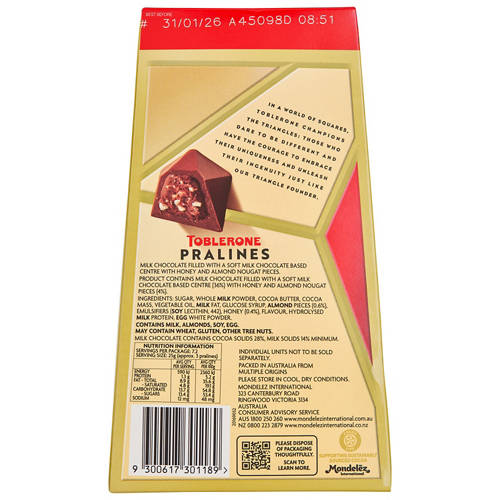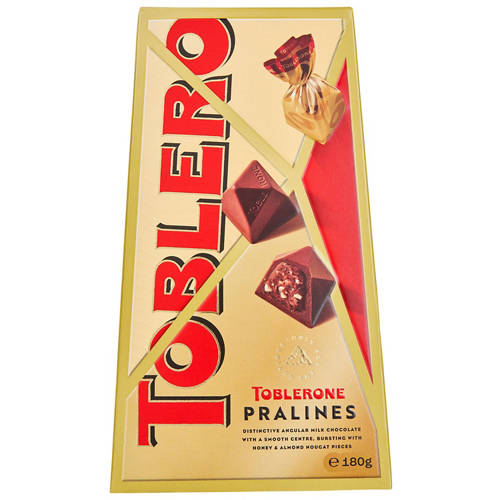 Indulge in the iconic taste of Toblerone with these smooth pralines. Featuring rich Swiss chocolate and crunchy honey-almond nougat, this 180g pack is perfect for gifting or sharing.