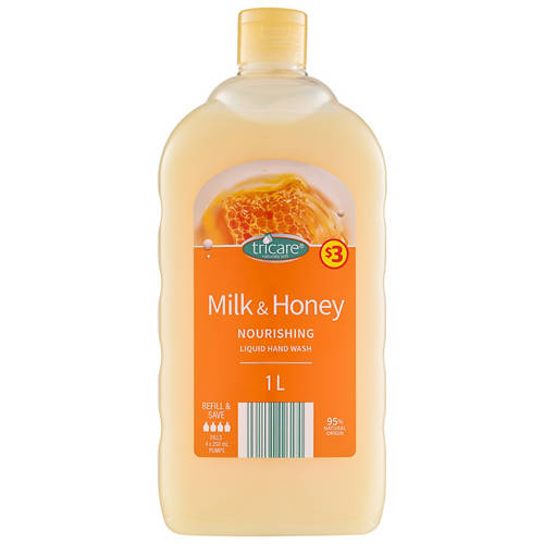 Tricare® Naturally Soft Nourishing Liquid Hand Wash is made with natural ingredients of milk protein and honey. Can be used in the bathroom, laundry and kitchen. A rich, creamy handwash that removes germs and reduces tightness after drying for a soft skin feel.50% recycled content. 0% parabens, phthalates, alcohol and ethyl alcohol, 2 hour defence. 95% natural origin. Dermatologically tested. Enriched with naturally derived antibacterial agent. Enriched with white tea extract. Grey water and septic tank safe. Kills 99.9% of germs. No mineral oils, silicones, soap, gluten, BPA or animal derivatives. Odour neutralising fragrance.50% recycled content. 0% parabens, phthalates or alcohol (ethyl alcohol). 95% natural origin. Dermatologically tested, Enriched with the natural ingredients of milk protein and honey.Grey water and septic tank safe. No mineral oils, silicones, soap, gluten or BPA. Odour neutralising fragrance.