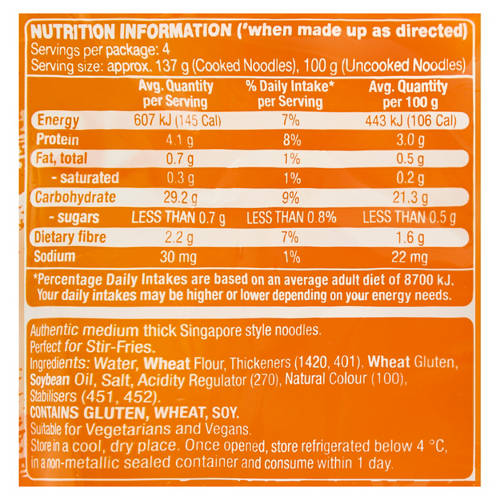 Enjoy stir fried noodles any night of the week with our ready made Singapore style noodles. Simply add your favourite protein and vegetables for a quick and delicious meal. A source of dietary fibre. 99% fat free. Made with no artificial colours and flavours. No added MSG. No added preservatives.