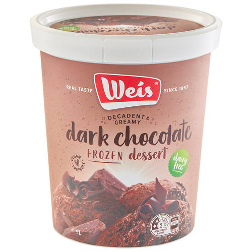 Made with Belgian Dark Chocolate, Weis Dark Chocolate Frozen Dessert is beautifully rich and indulgent, as chocolate should be! Perfect by itself or paired with just about anything, this dessert will satisfy all of your chocolate cravings. This sumptuous dessert is also dairy and gluten free making it too good not to try..