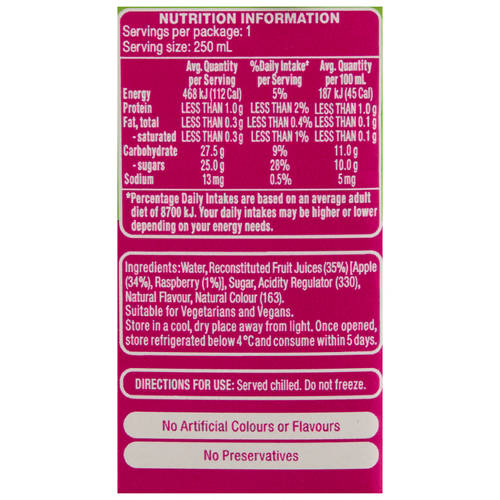 A refreshing apple raspberry drink, served conveniently in a pack of six. Made using real juice, with no artificial colours, flavours or preservatives.