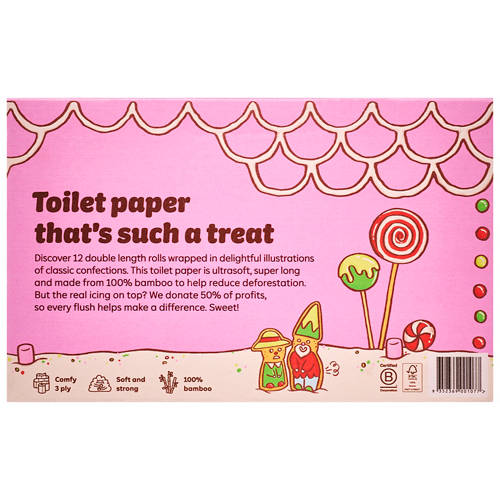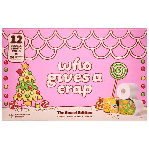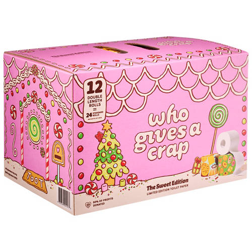The iconic Who Gives A Crap providing a box of individually wrapped toilet paper rolls featuring festive, artist-designed patterns.