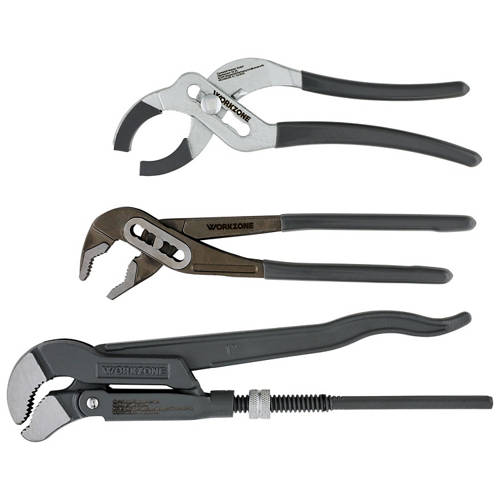 - 3 piece Pipe Wrench Set with 250mm water pump pliers, 320mm Swedish pipe wrench and 235mm curved jaw pliers
