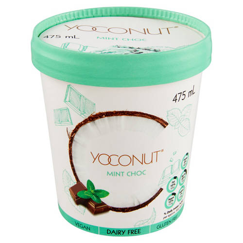 Creamy mint flavoured coconut frozen dessert with choc chips.Vegan, dairy free, gluten free.
